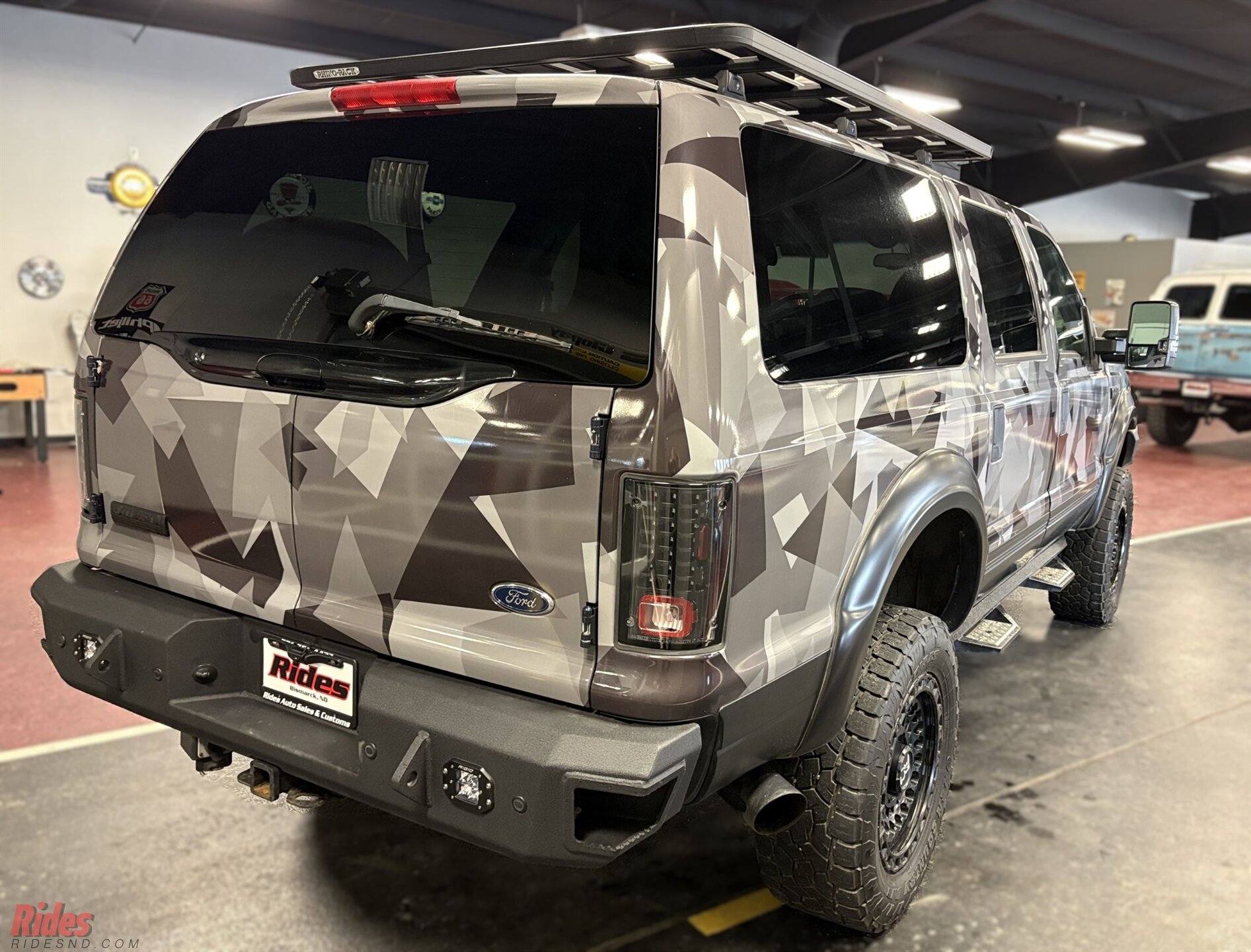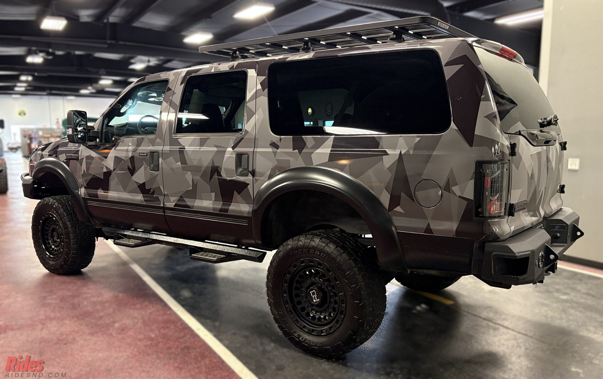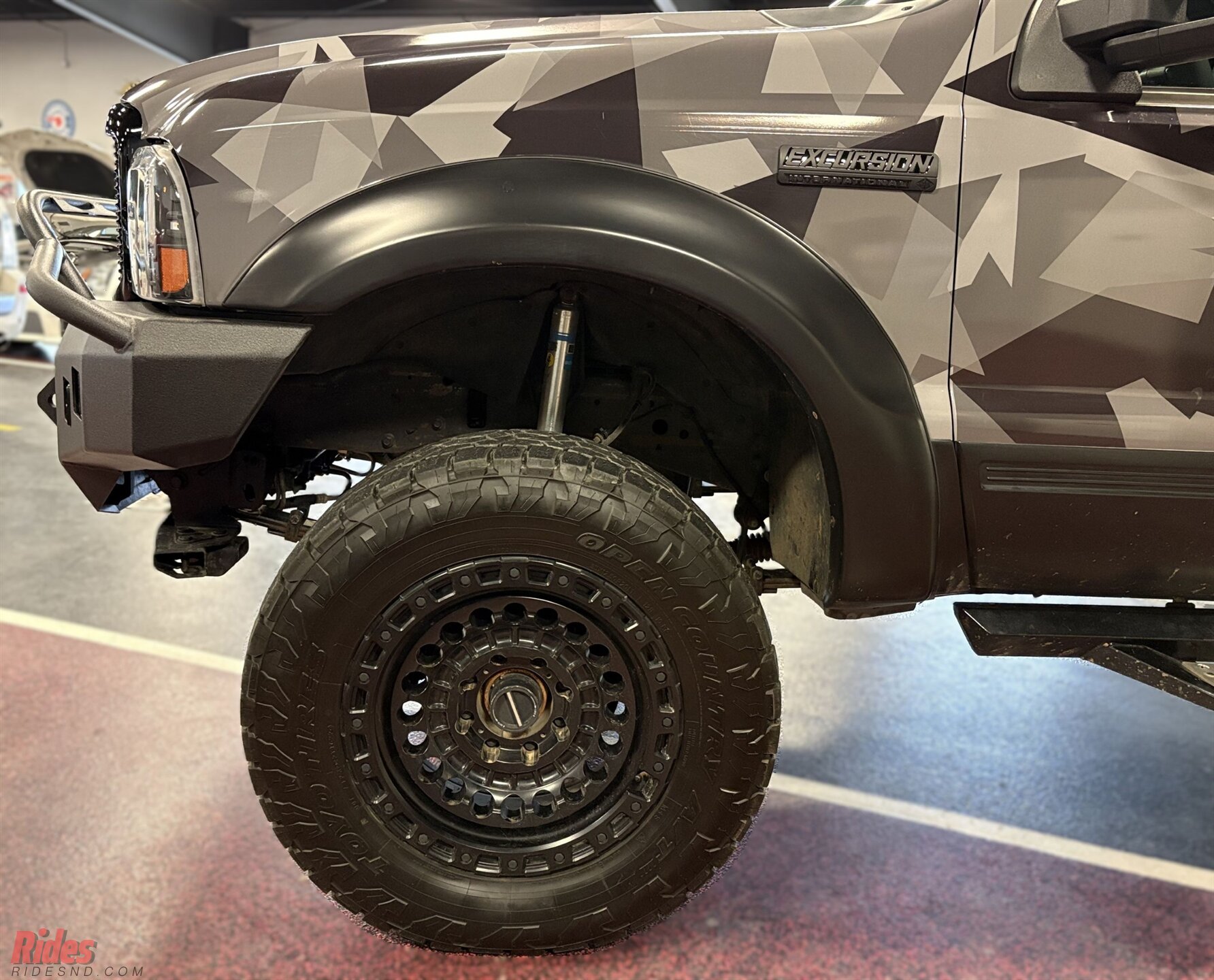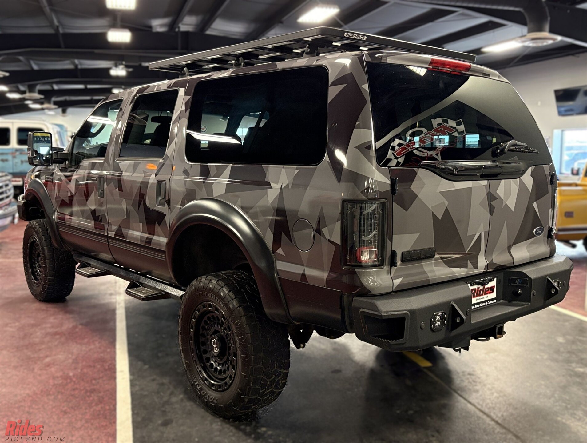 Wrapped in a sharp urban camo scheme, this Excursion doesn’t just blend in, it makes a statement at camp before sunrise. A 6-inch suspension lift plants it high above the ruts, while massive 37-inch Black Rhino wheels give it the kind of stance that clears brush and commands respect at the trailhead.