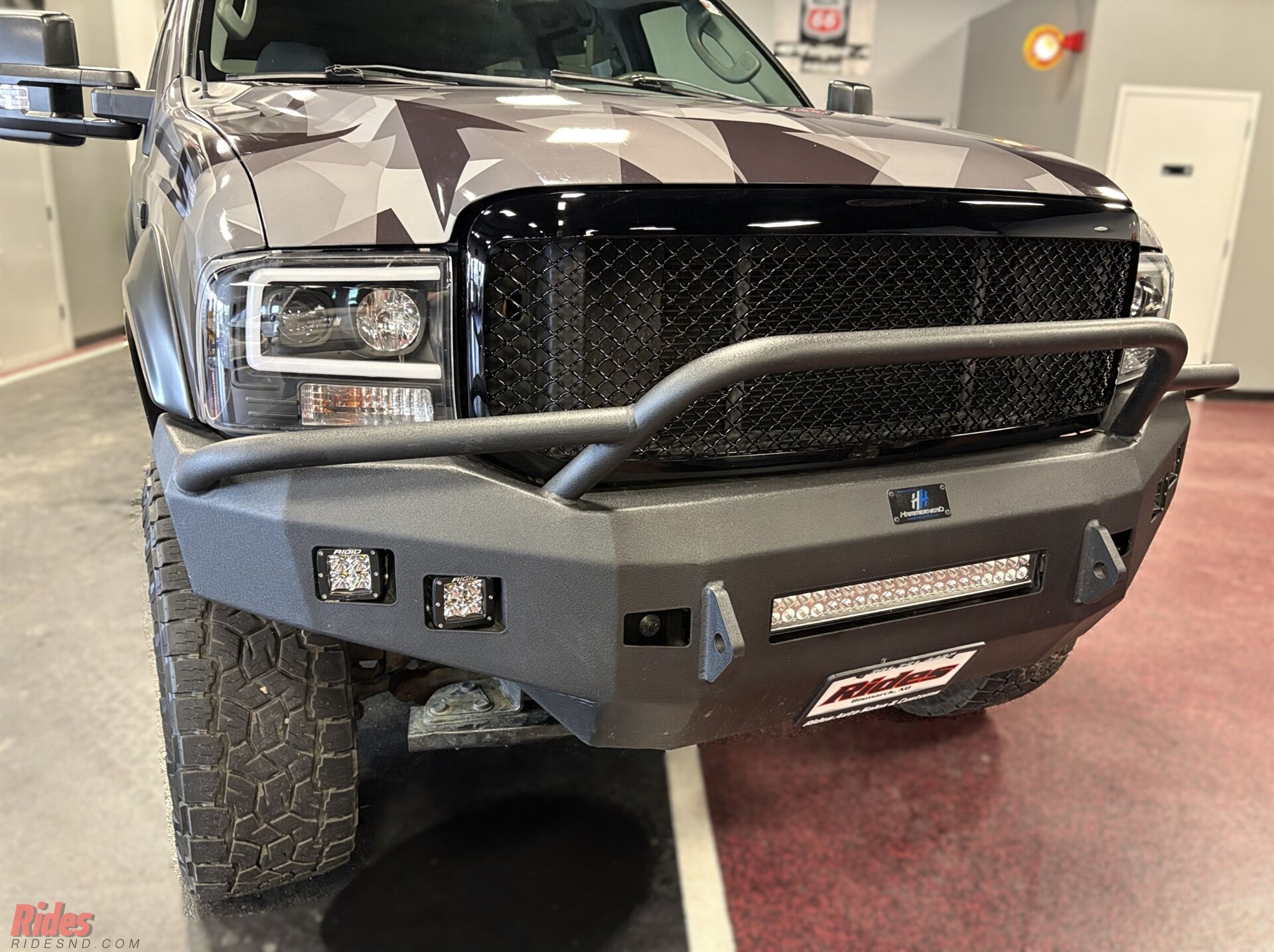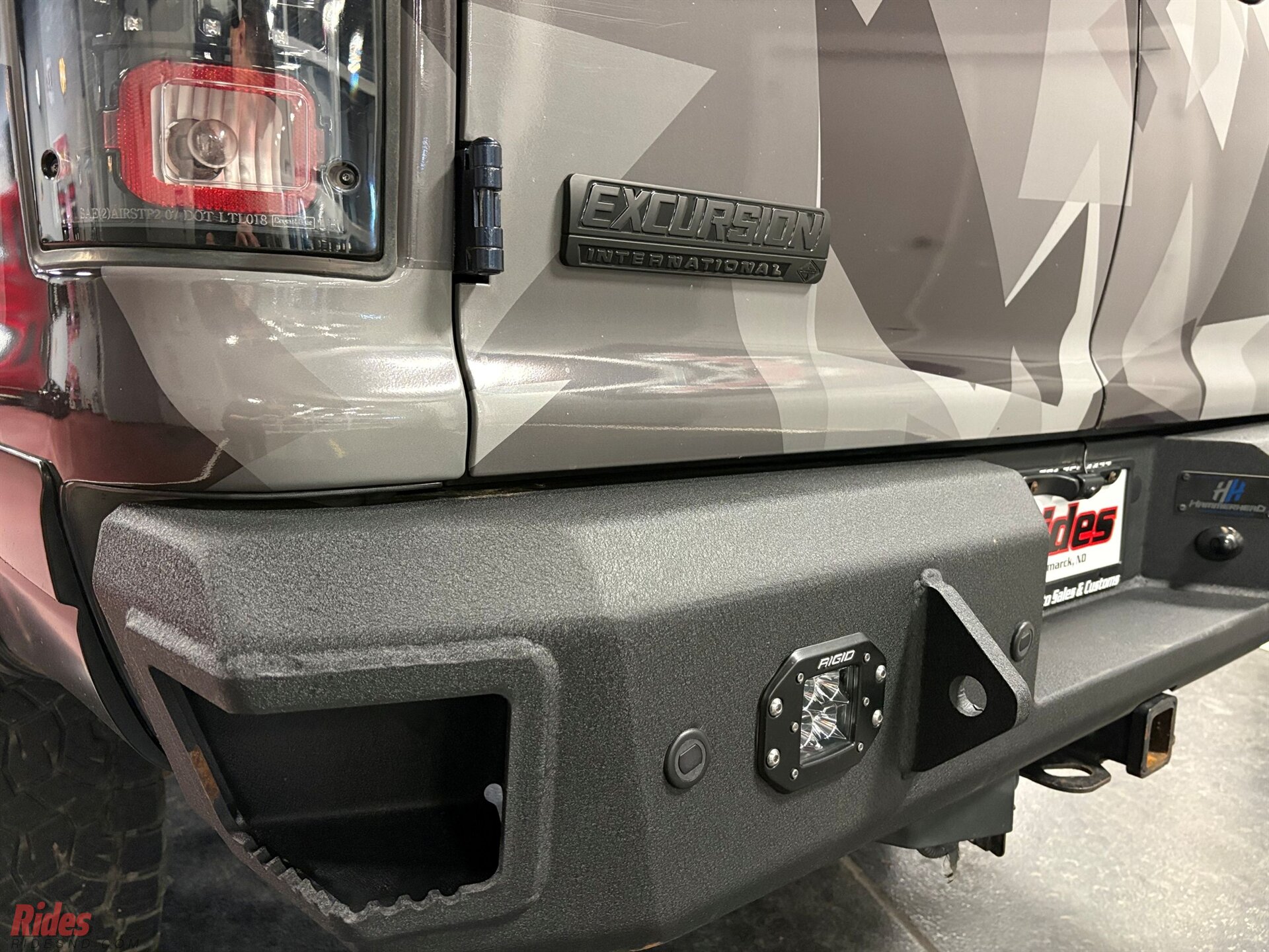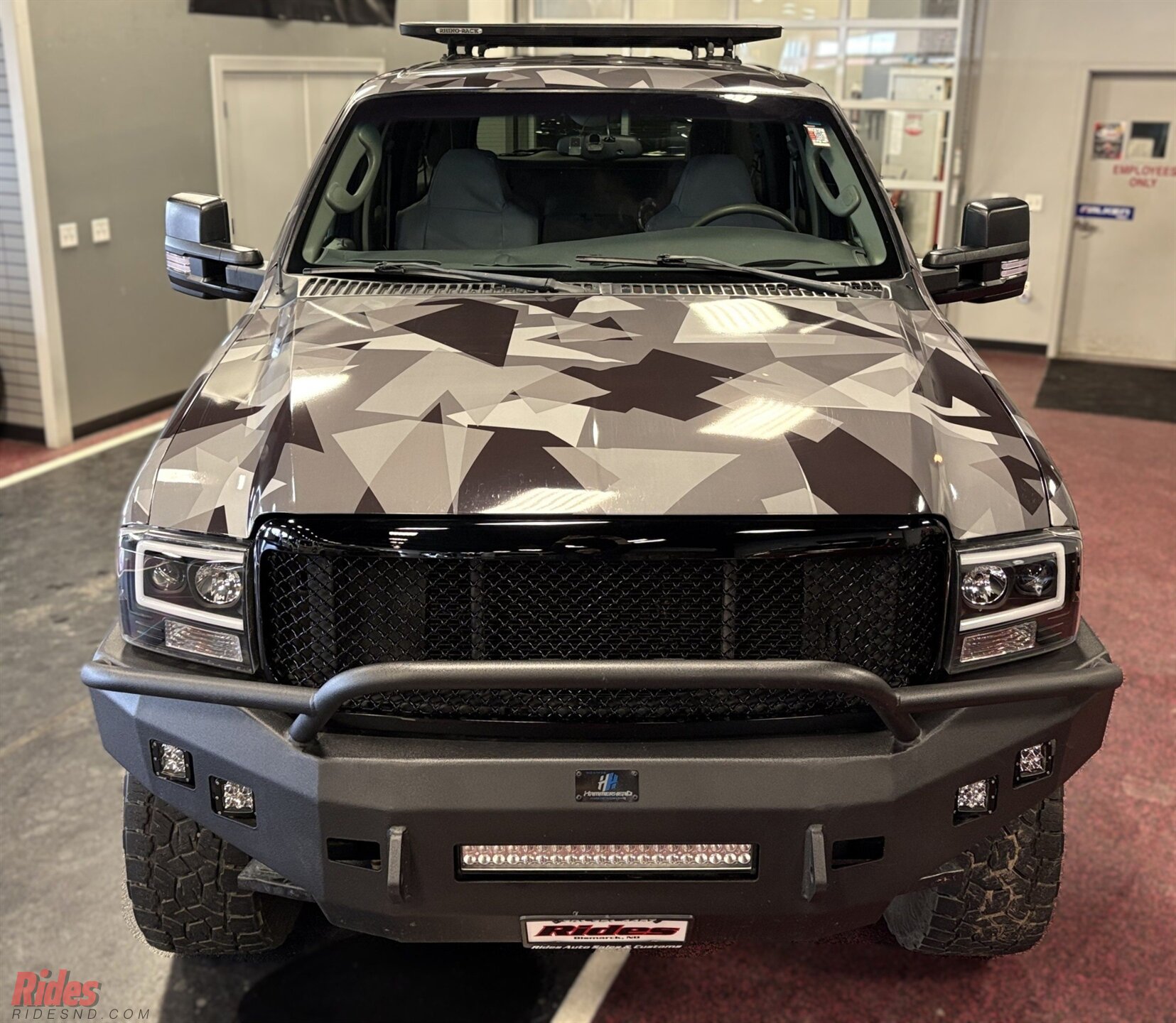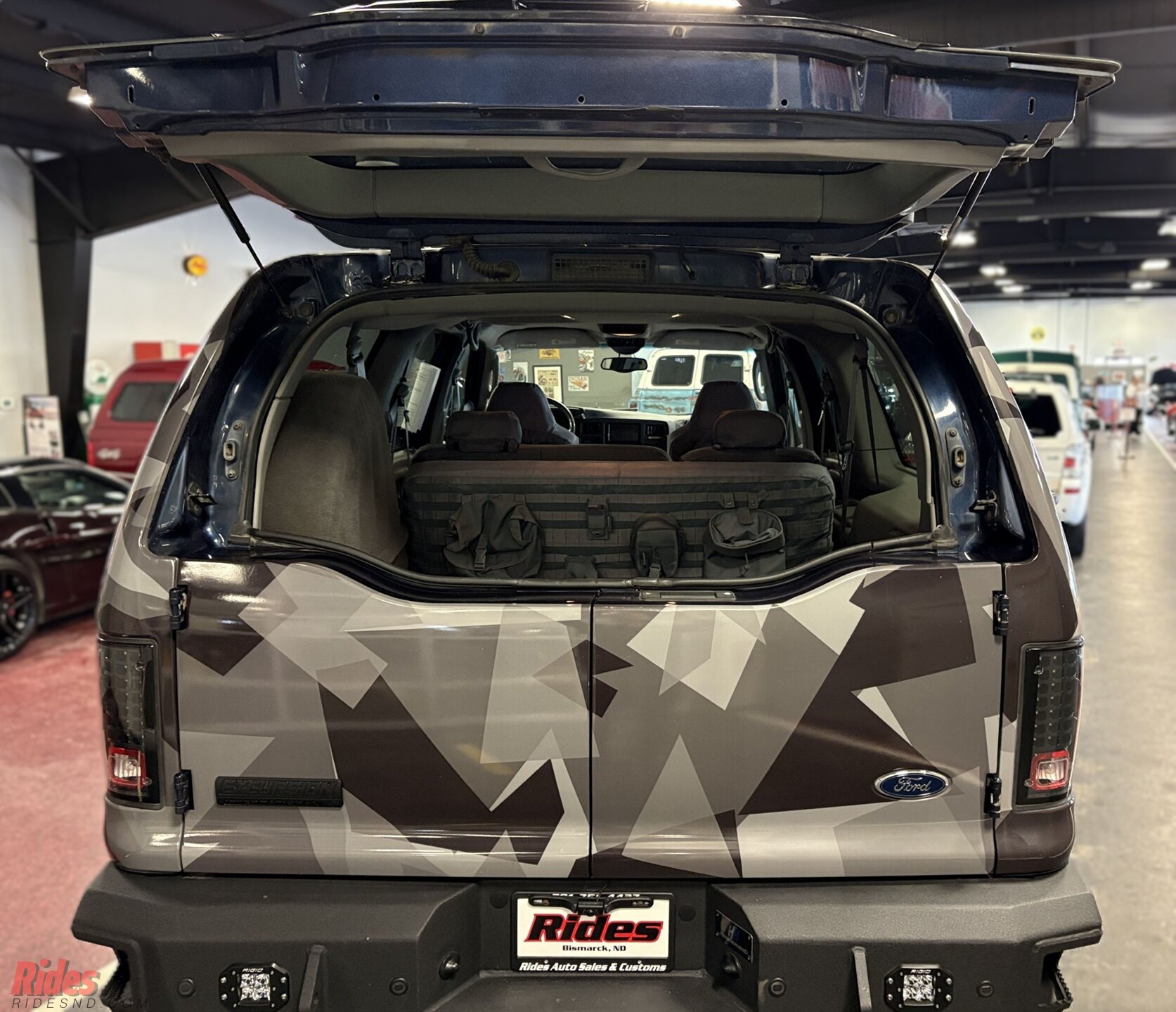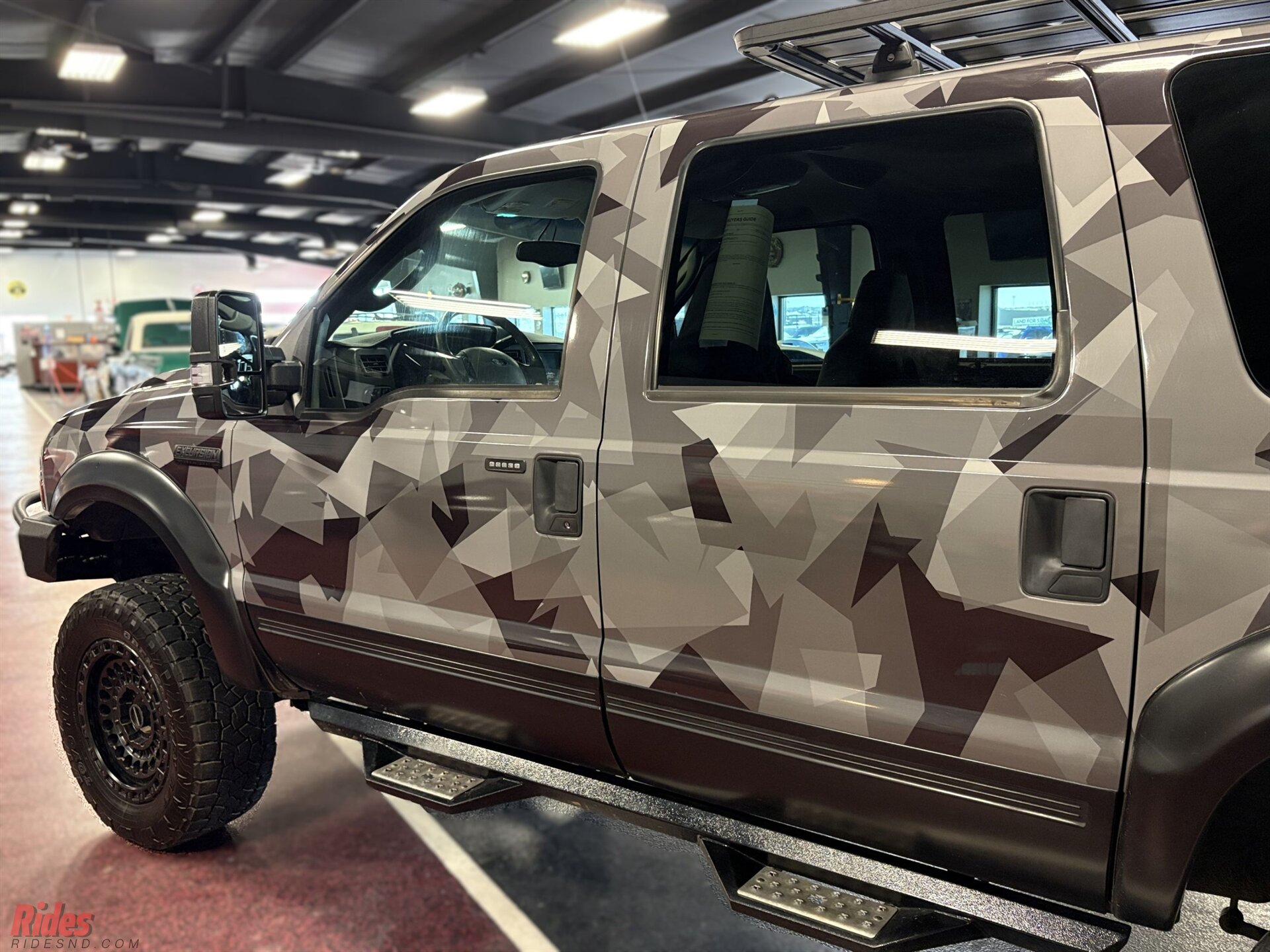 Wrapped in a sharp urban camo scheme, this Excursion doesn’t just blend in, it makes a statement at camp before sunrise. A 6-inch suspension lift plants it high above the ruts, while massive 37-inch Black Rhino wheels give it the kind of stance that clears brush and commands respect at the trailhead.