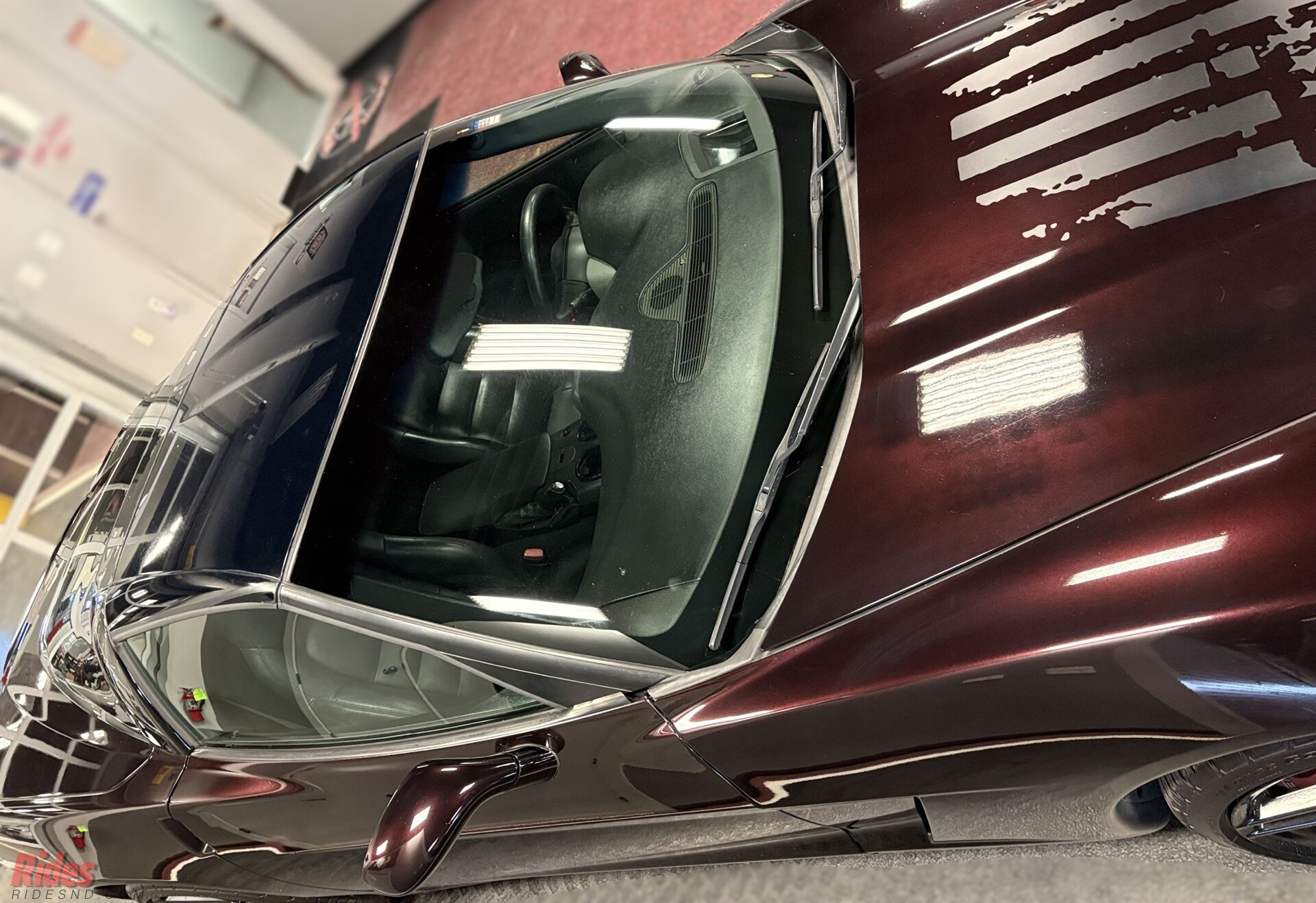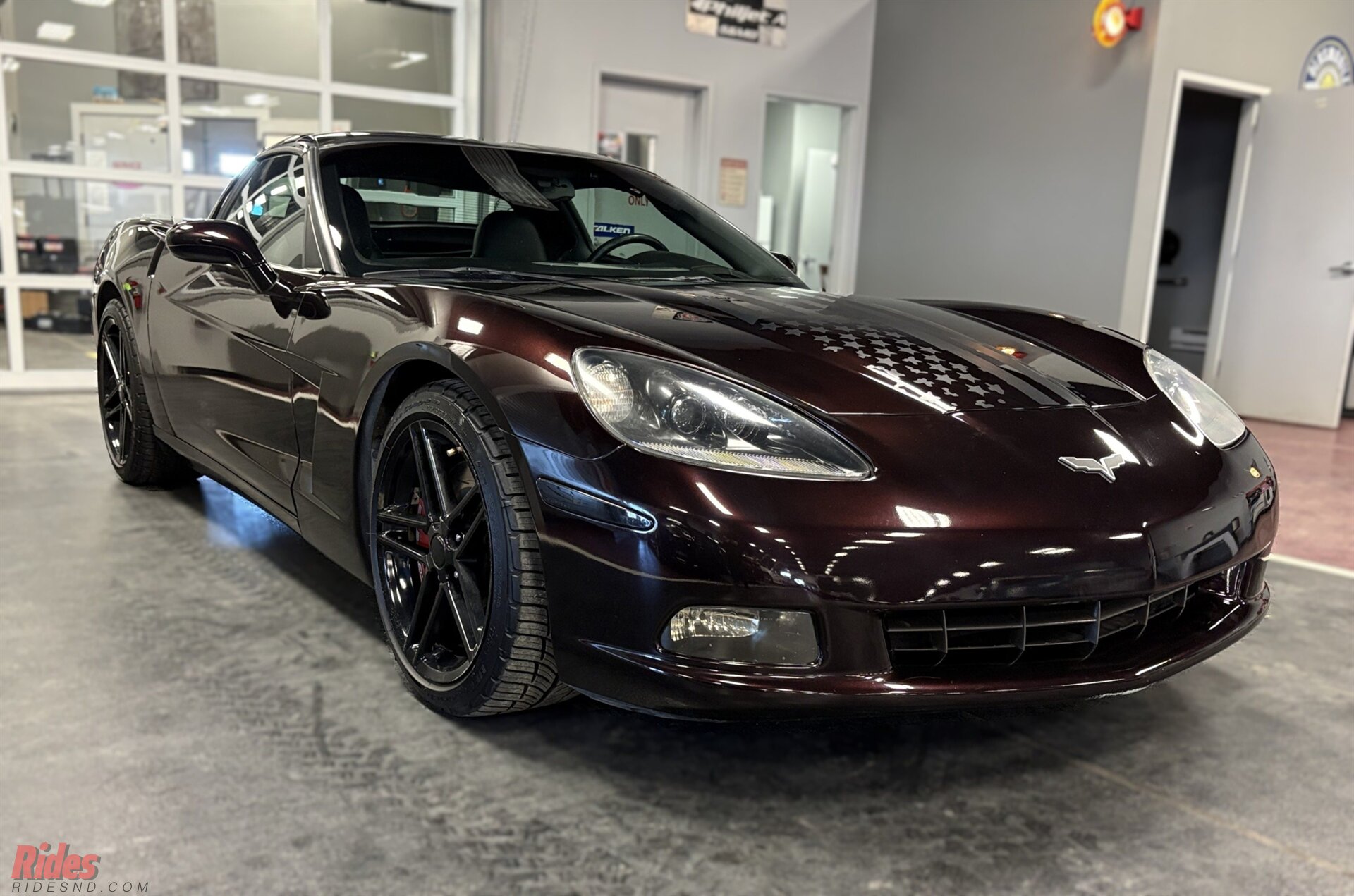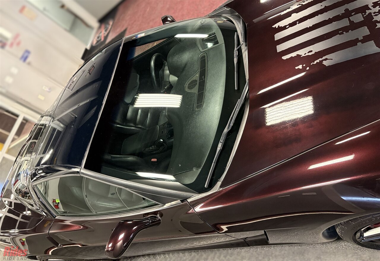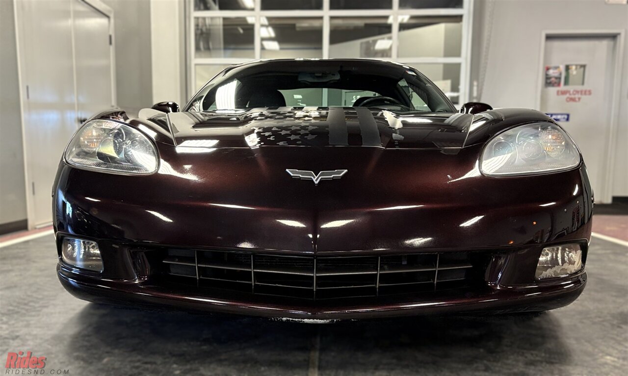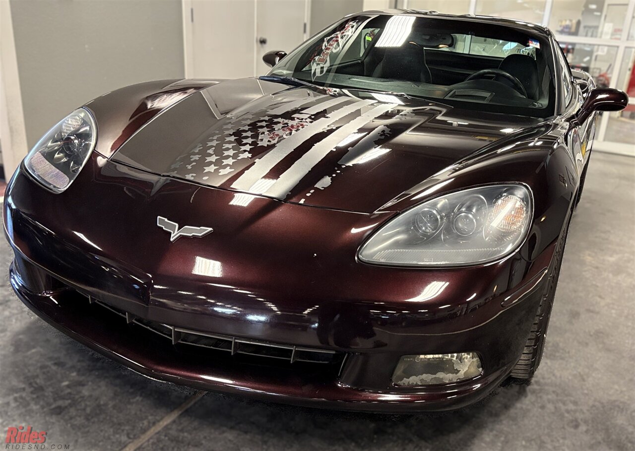 Finished in deep Black Cherry, this 2005 Chevrolet Corvette carries a sinister presence thanks to a full blackout treatment that gives the car a bold, modern edge. Across the hood sits a striking American flag decal, a visual salute that makes the car impossible to miss whether it’s parked at a cruise night or rolling down the highway.