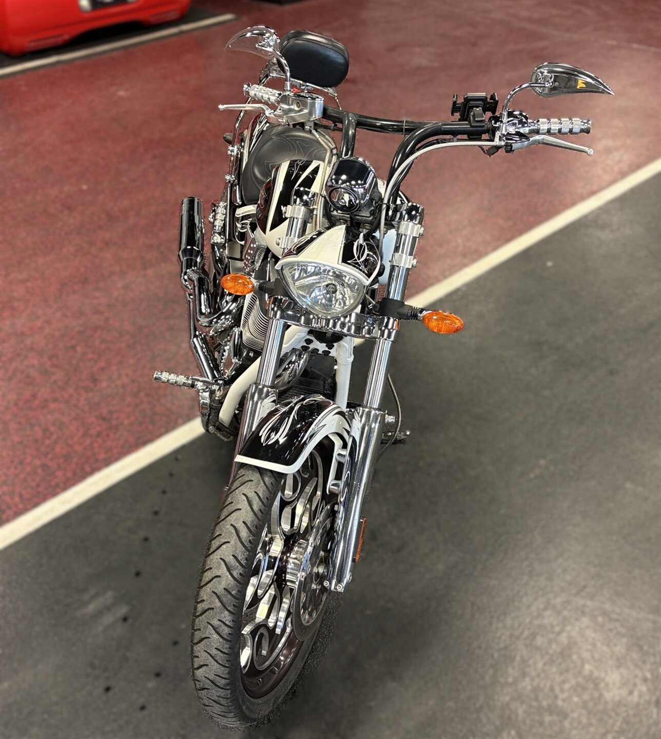 The riding position is relaxed but commanding, with forward controls and a long, stretched frame that turns every ride into a statement. Whether it’s parked at a show, cruising Main Street, or sitting front-row in a collector’s garage, this bike has the kind of visual punch that stops conversations mid-sentence.