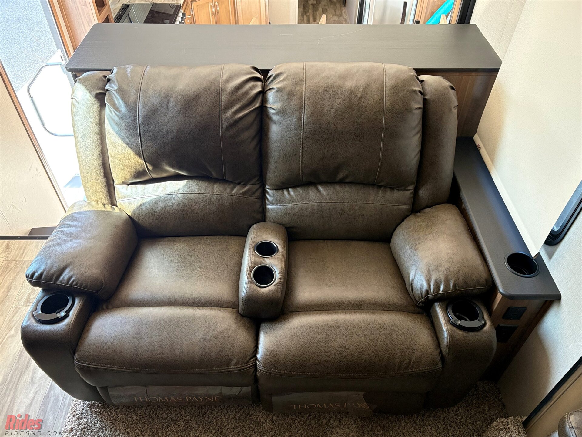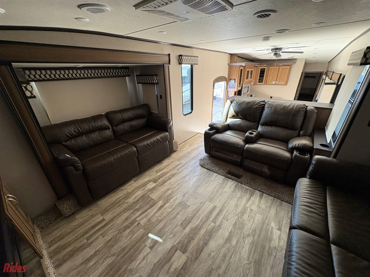 Up front, the elevated living area is your personal lounge retreat, featuring a full front entertainment center with 5,000 BTU fireplace, surrounded by dual tri-fold leather sofas and plush theater seating. It’s the kind of space that invites movie nights, game days, or simply kicking back in serious comfort.