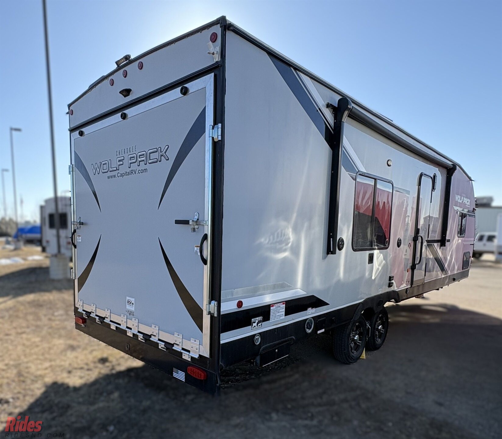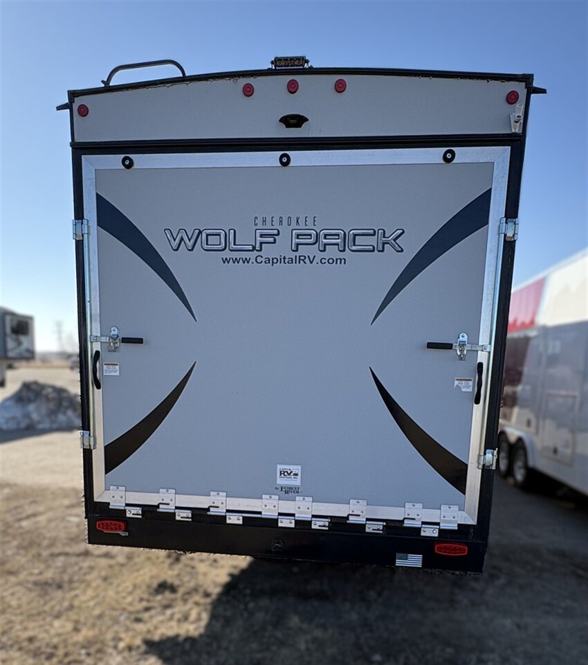 The versatile Cherokee Wolf Pack toy haulers are ready for all your excursions. Each model includes a true high gloss gel coat, a 102" wide body design, and a forced air heated underbelly and enclosed holding tanks so you can camp year around. You will enjoy hassle-free features such as, the in-cab tire pressure monitor system, the Happijac bed lift system, and the 100 gallon fresh water capacity. Each model includes a shower skylight, LED interior/exterior lights, Zebra shades in the living area, and a black stainless steel farm sink for that added touch-of-home.