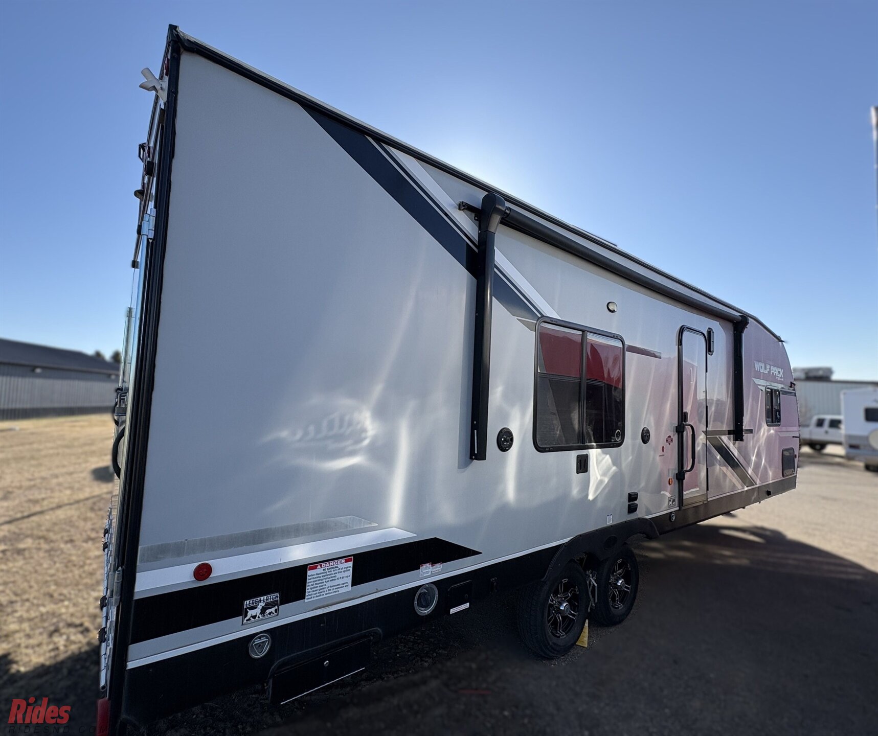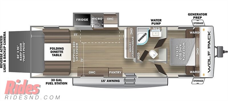 Camping with your favorite ride-on toys just got a whole lot easier in this toy hauler travel trailer. Once your toys are unloaded from the 15' garage, enjoy a cold drink at the removable dinette table before heading out on a trail. The radius shower in the dual entry bath will allow you to clean up once you return, and you'll find all the kitchen appliances needed to prepare dinner after your shower. The kids will find sleeping space on the two sofa beds and the Happijac power bed above, while you enjoy the Wolf Pack king bed in the front master bedroom!