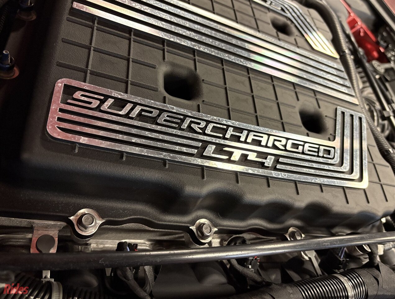 Beneath that sculpted hood lives a supercharged 6.2L LT4 V8 producing 650 horsepower and 650 lb ft of torque. The kind of numbers that rearrange horizons. Press the throttle and the Eaton blower sings its metallic aria while the quad exhaust delivers a soundtrack that feels like a front row seat at a private track day.